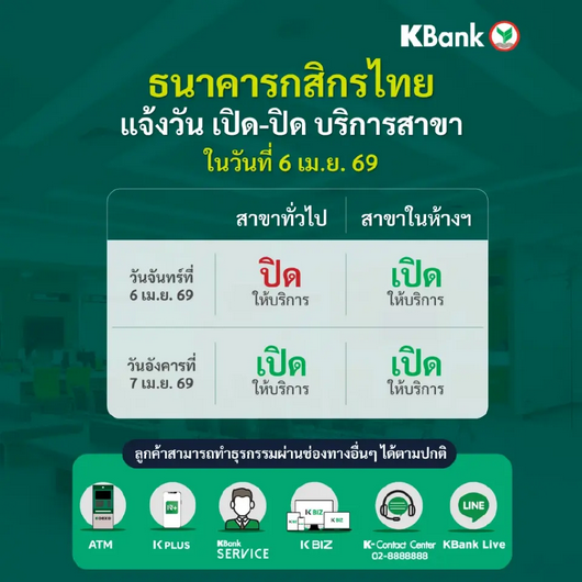จากกรณี ธนาคารกสิกร ได้ออกมาประกาศเตือนลูกค้าทุกคนโดยระบุว่า ธนาคารกสิกรไทย แจ้งวันทำการสาขาในช่วงวันหยุด เนื่องในวันสมเด็จพระพุทธยอดฟ้าจุฬาโลกมหาราช และ วันที่ระลึกมหาจักรีบรมราชวงศ์ วันที่ 6 เมษายน 2569
