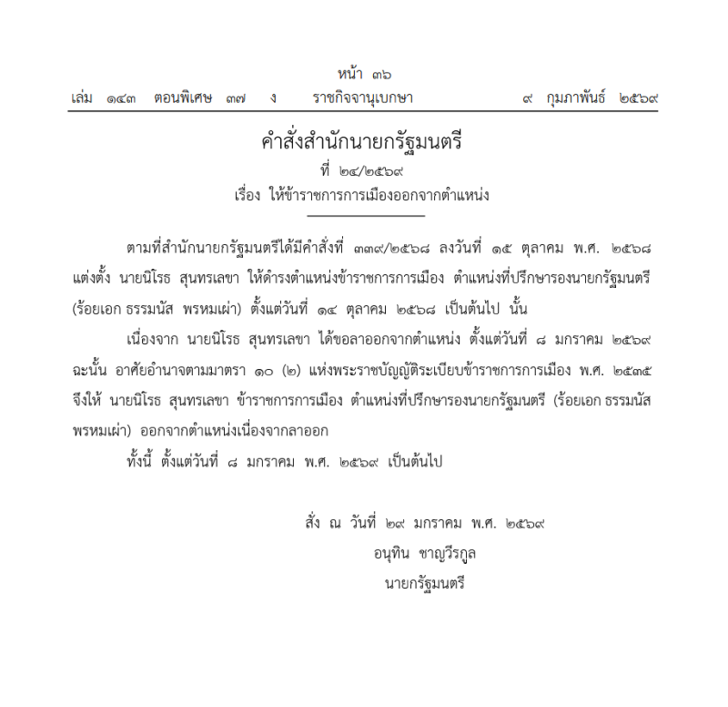 วันที่ 10 กุมภาพันธ์ 2569 มีรายงานว่า เว็บไซต์ ราชกิจจานุเบกษา ได้เผยเเพร่ประกาศ คำสั่งสำนักนายกรัฐมนตรี ที่ 24/2569 เรื่อง ให้ข้าราชการการเมืองออกจากตำแหน่ง