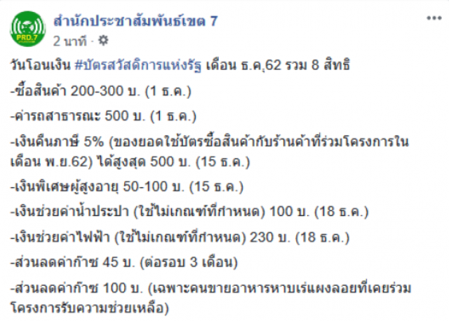 วันโอนเงิน บัตรสวัสดิการแห่งรัฐ เดือน ธันวาคม 62 รวม 8 สิทธิ