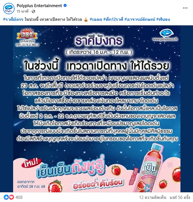 วันนี้ 28 ก.ย. 68 เพจเฟซบุ๊ก Polyplus Entertainment ได้ออกมาโพสต์เปิดคำทนายของ หมอลักษณ์ ฟันธง ในรายการ ศึก 12 ราศี ทางช่อง 3 รีบเช็กด่วนๆเลยค่ะ