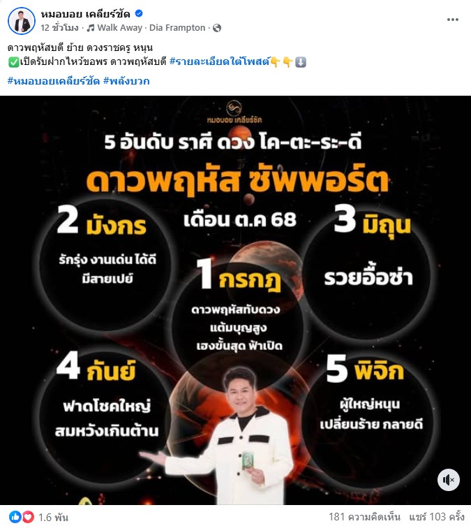 ดวงชะตาของเรามีการเปลี่ยนแปลง ใครที่เป็นสายมูหรือชื่นชอบในการดูดวง รีบเช็กด่วนๆเลยค่ะ ก่อนหน้านี้เมื่อวันที่ 1 ต.ค. 68 ที่ผ่านมา หมอบอย เคลียร์ชัด ได้ออกมาโพสต์เปิดคำทำนายแล้ว
