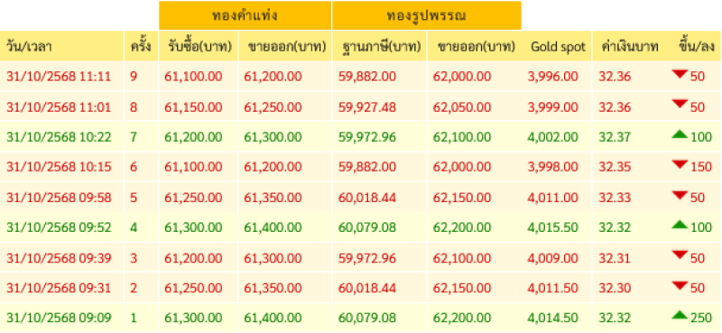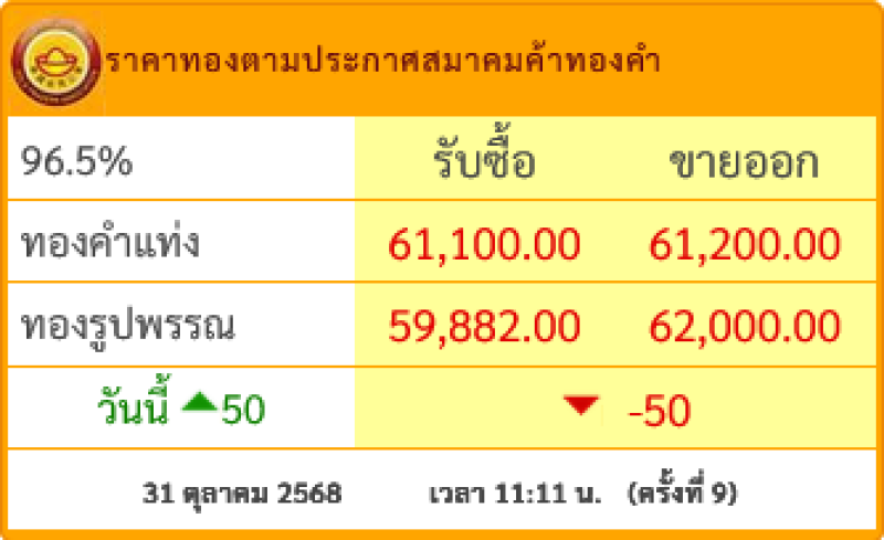 ราคาทองคำ วันที่ 31 ตุลาคม 2568 เวลา 11:11 น. (ครั้งที่ 9)